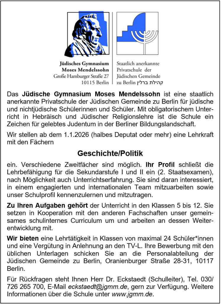 Wir stellen ab Januar 2026 (halbes Deputat oder mehr) eine Lehrkraft mit den Fächern Geschichte/Politik ein: