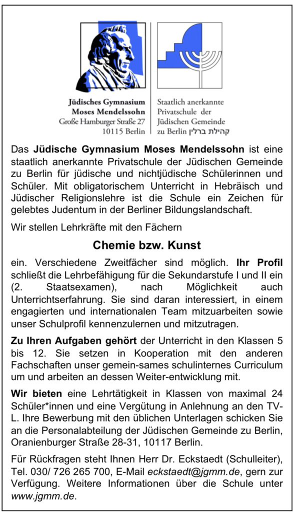 Auch an den Jüdischen Oberschulen können Sie Ihr 2. Staatsexamen absolvieren! Wenn Sie sich für das Referendariat an unseren Schulen interessieren, so sollten Sie uns frühzeitig vor den Anmeldefristen der Senatsbildungsverwaltung kontaktieren. Eine Zuteilung über die Senatsbildungsverwaltung an unsere Schulen ist nicht möglich, da sich die Schulen in der Trägerschaft der Jüdischen Gemeinde zu Berlin befindet. Wenn Sie bei uns Ihr 2. Staatsexamen absolvieren, so werden Sie als Lehrkraft angestellt und von der Jüdischen Gemeinde zu Berlin als Gast in den öffentlichen Studienseminaren angemeldet.